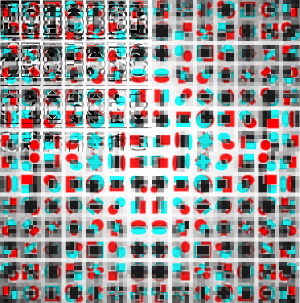 In this project, I had to create 49 boxes that each had a different design. I had to create the rows of boxes first, and then fill each with a different design. I was inspired by the look of 3d glasses with red and blue lenses and a black frame. I wanted mine to be a stand-out piece that caught people’s attention and was a lot to look at. I used emphasis in my background gradient that carries your eyes to the center of the piece.