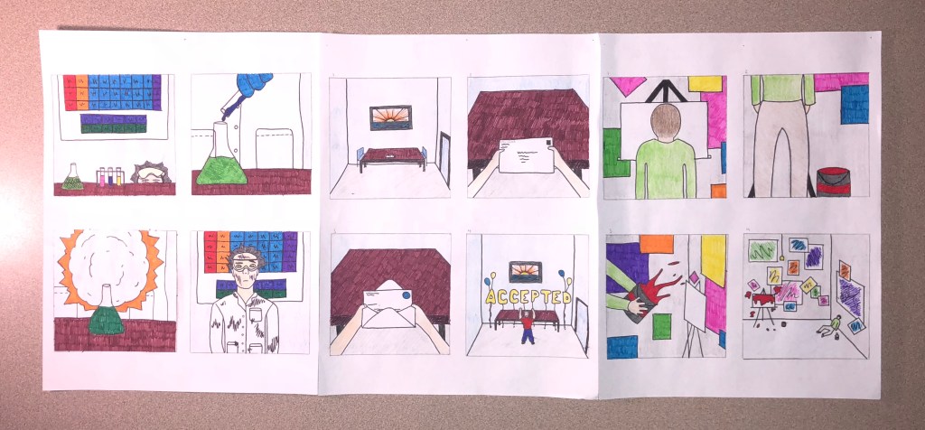 Storyboarding is a gateway for creativity. They are an easy route for visual storytelling. When given the direction to draw our own stories in class with our own ideas and illustrations, there were several moans and groans of ‘I can’t do this.’ Most people think they’re unable to draw, mainly because they don’ think that they are able to draw well. This is a common reaction for most of us when we are told to draw. However, in the video “Lynda Barry, Graphic Novelist, Cartoonist, and Educator | 2019 MacArthur Fellow” Lynda Barry states, “Whenever anybody finds out I’m a cartoonist or a writer, they always say, ‘Oh I wish I could draw, I wish I could write.’ Most people give up on drawing when they think they can’t draw a nose or they can’t draw hands, but comics leaps right over that problem.” Storyboards can be as simple or complex as you would personally like them to be, they just have to tell a story.