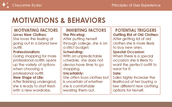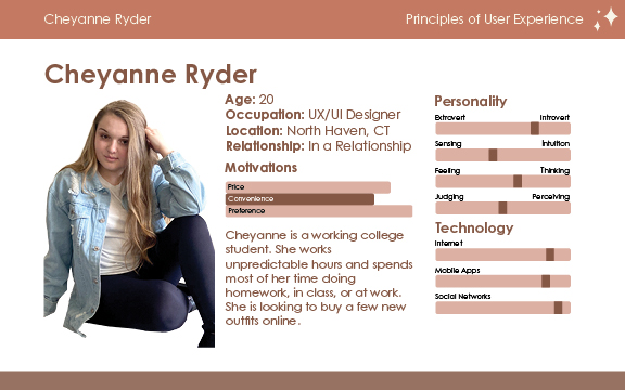 Time to give your persona some personality! Are they more extroverted or introverted? Do they rely on their senses or intuition more? Do they rely on their thoughts or feelings more? Do they judge more or perceive more? When you have these factors identified, it is easier to understand the personality type of each persona.