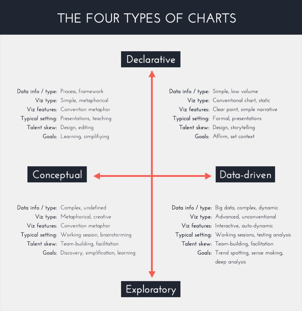 The conceptual-declarative quadrant of the grid can also be described as the “idea illustration” quadrant. The key word of this quadrant is simple. Although the information and data they may be presenting may be a bit complex, the visualization itself is very simple. Author, Daniel Mullins explains, “This type of visualization is used to present processes and frameworks with the aim of simplifying an otherwise complex concept.” The type of visualizations that fall within this quadrant call upon metaphors to simplify complex ideas for easier audience understanding.