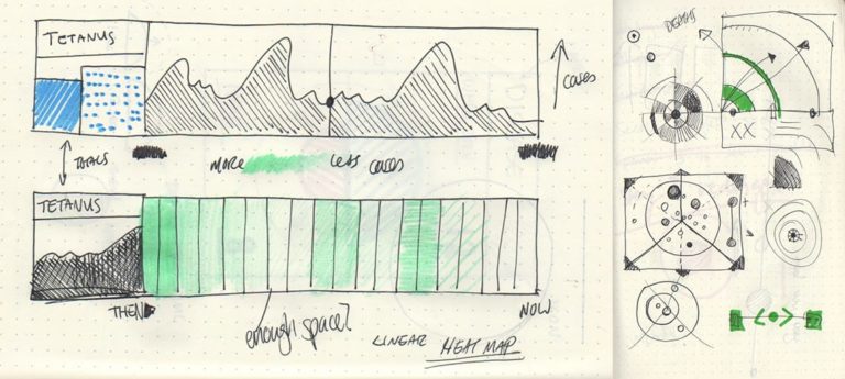 This example of a conceptual-exploratory visualization highlights the informal, unrefined nature of the quadrant. The individual developing this visualization is working through ideas, sketching, and generating ideas to represent the data at hand. Because the structure is informal here, it is likely that this visualization will not be presented to a large audience and will likely rather be used for collaborative group settings to facilitate idea generation, as the quadrant says.