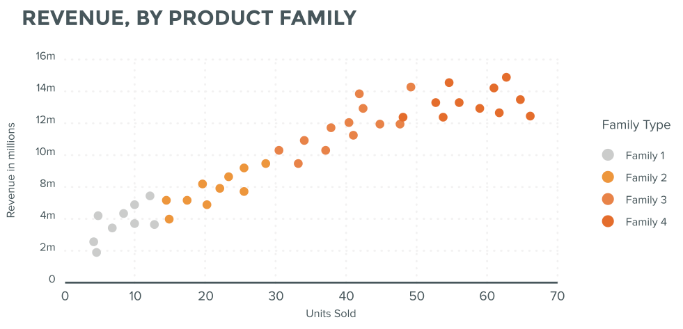 This example of a data-drive-declarative visualization highlights the revenue, by product family for a business. You can see the data set is fairly small and does not try to represent more than trends or patterns. The scatter plot simply and efficiently presents the information to the audience for them to quickly and easily interpret the information and data the visualization is presenting.