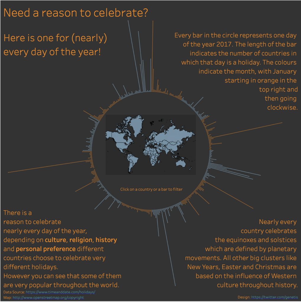 This example of a data-driven-exploratory visualization provides the interactive style of the quadrant. This visualization presents a chart where each line represents a day of the year, and the longer the line is the more people around the world celebrate that day. You can filter the chart by country, or click on a bar to get even more specific information depending on what you, the viewer, are looking for. Here is the link if you would like to check it out for yourself!
