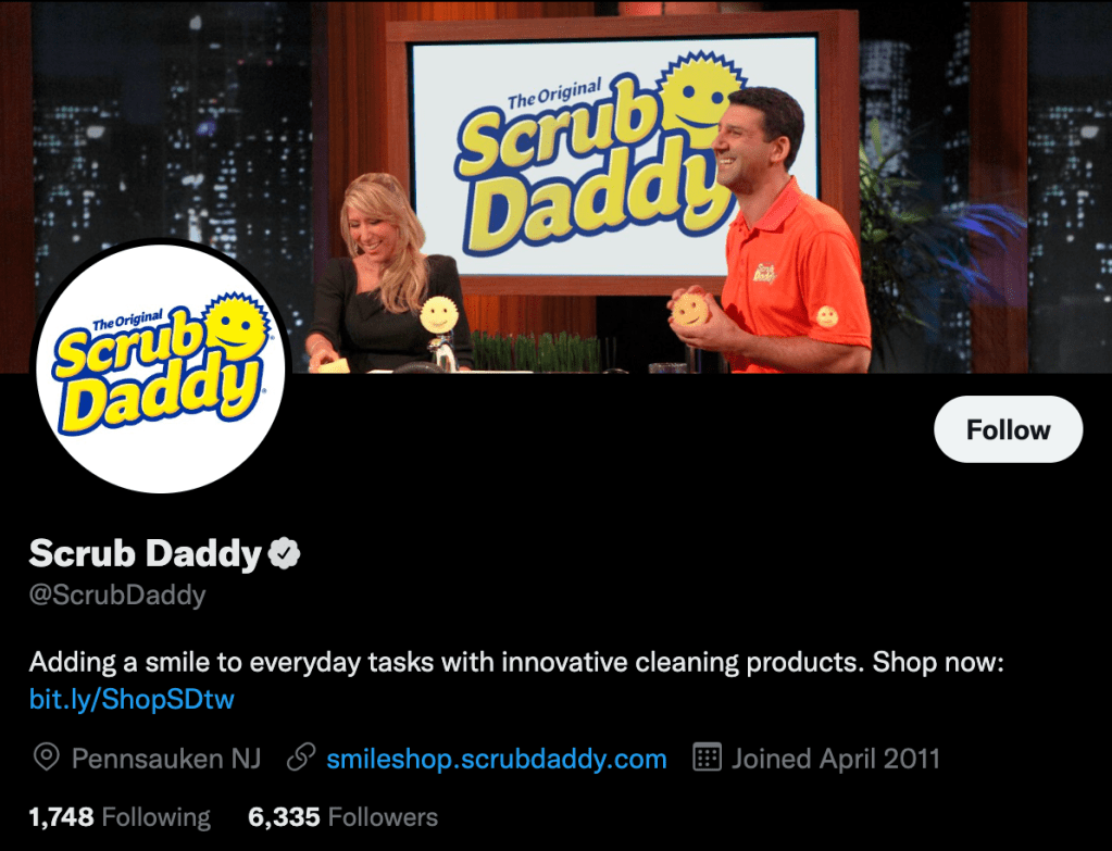 Starting with Scrub Daddy’s Twitter account (found here), it surprisingly had a smaller follower count than I would have expected with only 6,335 followers. The account averaged about 8 posts per week and these posts were typically comprised of photos and text-only tweets.