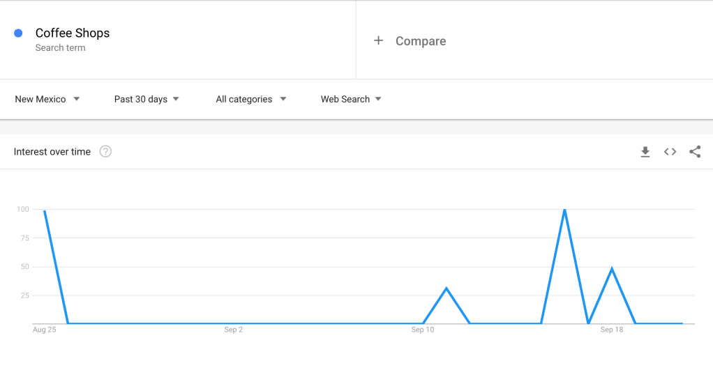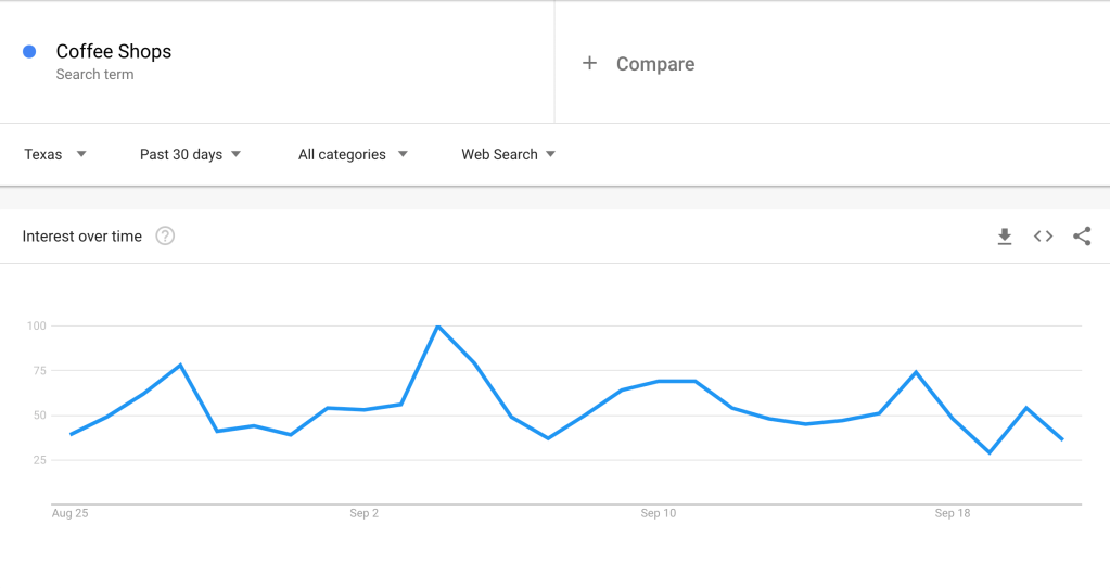 In this graph, shown below, you can see the results for “coffee shops” web searches in Texas over the past 30 days. These results, again, show a bit of fluctuation, but range from about 25-100 searches.