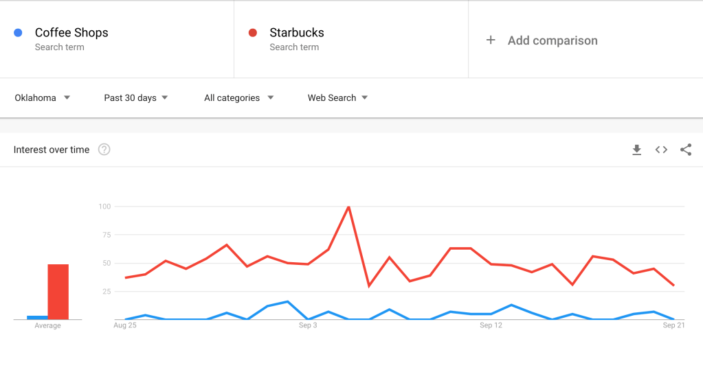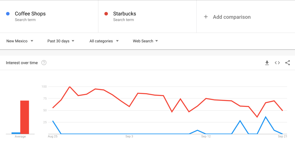 I then compared the search results for “coffee shops” and “Starbucks” to see if there was more interest in one rather than the other, and was quite surprised. In Texas, there was significantly more search interest for Starbucks rather than “coffee shops” in general.