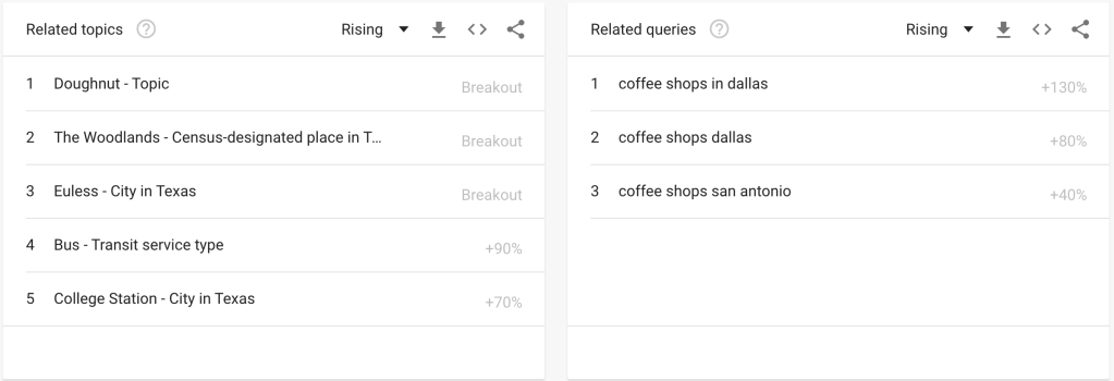 Google Trends also shows the results for related topics and related queries as well, which can be beneficial for businesses in their competitive analysis as well. The results are shown below when I input “coffee shops” and set the location as Texas and the time frame as the last 30 days.