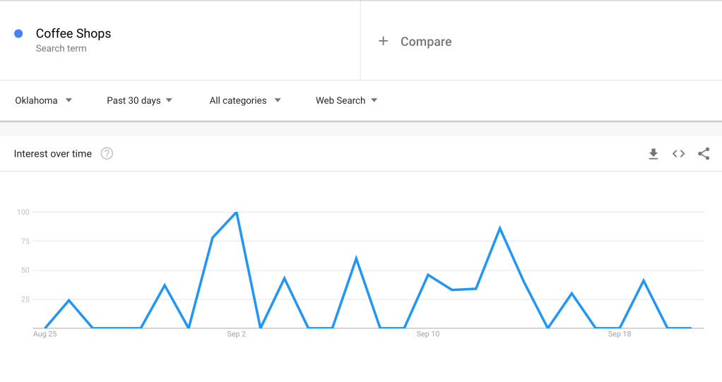 However, the results for New Mexico and Oklahoma were not so promising. The graphs below show that the searches for “coffee shops” in New Mexico ranged from 0-100 searches, although for the past 30 days there was mostly no search interest. The results for Oklahoma were slightly more promising than those of New Mexico, again with a range of 0-100 searches, but there was not as much time with no interest.